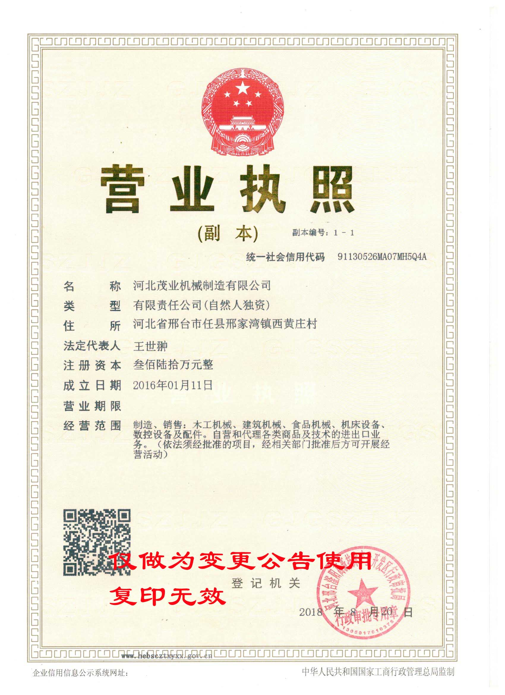 我司邢臺(tái)茂業(yè)機(jī)械制造有限公司,因公司業(yè)務(wù)發(fā)展的需要,現(xiàn)已整體變更為河北茂業(yè)機(jī)械制造有限公司,并于2018年8月20日取得河北邢臺(tái)滏陽高新技術(shù)產(chǎn)業(yè)開發(fā)區(qū)審批局頒發(fā)的營(yíng)業(yè)執(zhí)照?,F(xiàn)將有關(guān)事項(xiàng)公告如下: